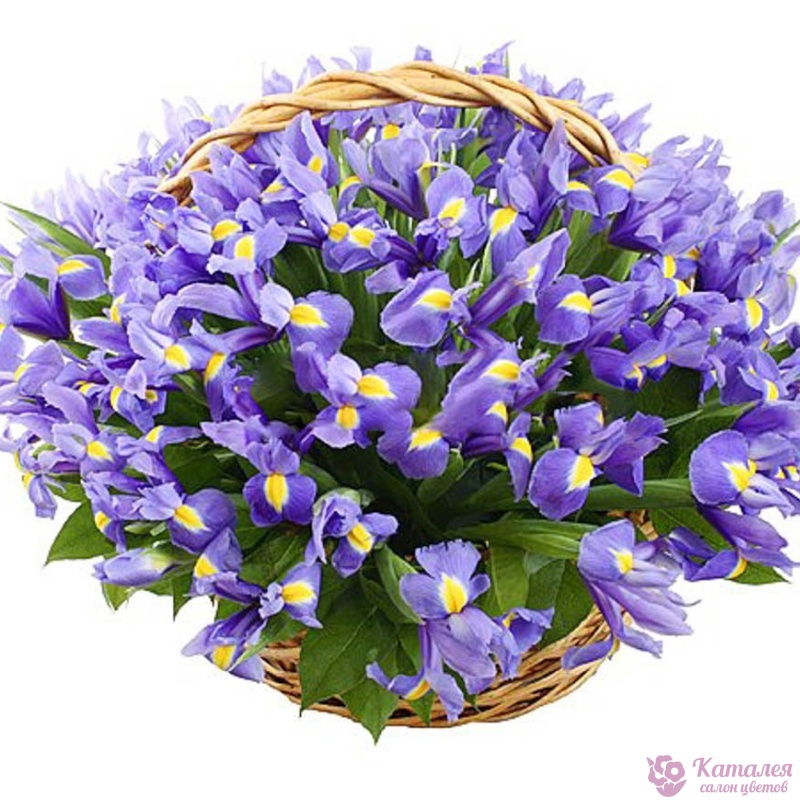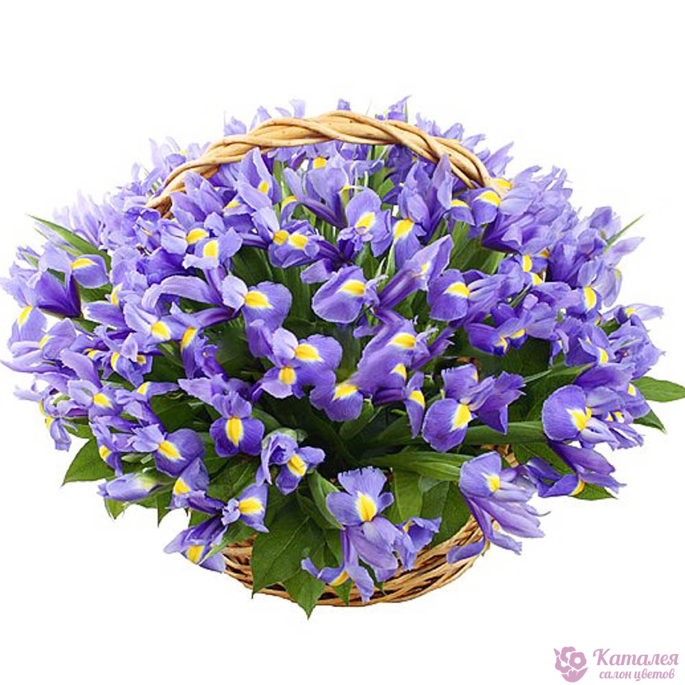 Букет состоит из 75 ирисов, зелень, корзина.