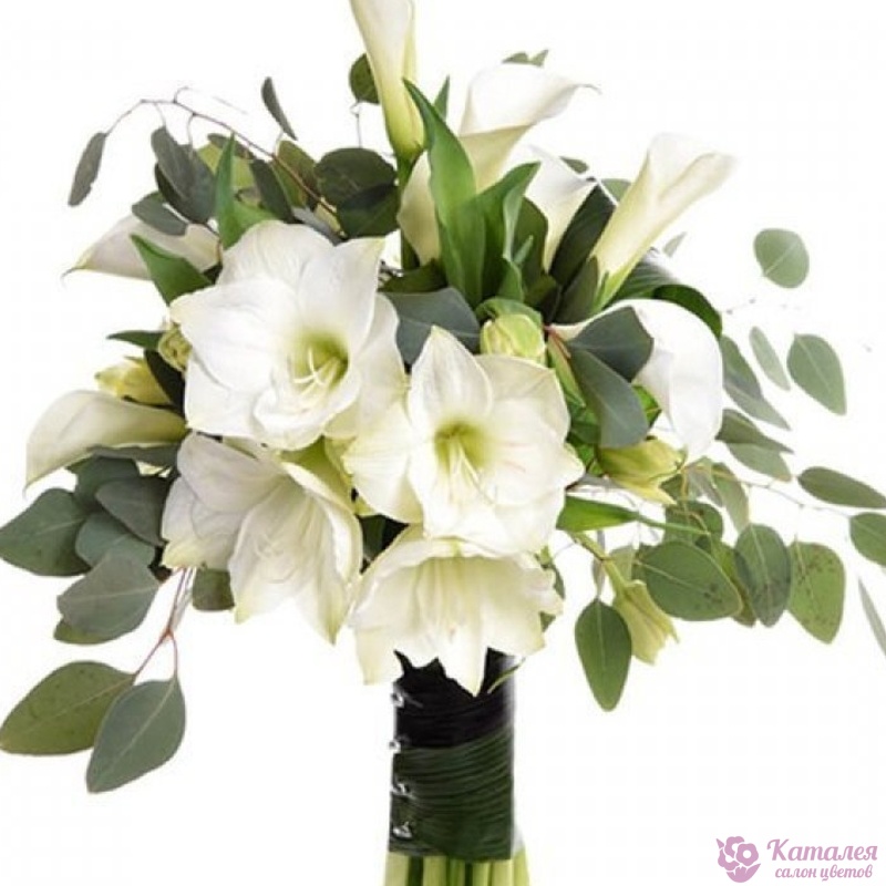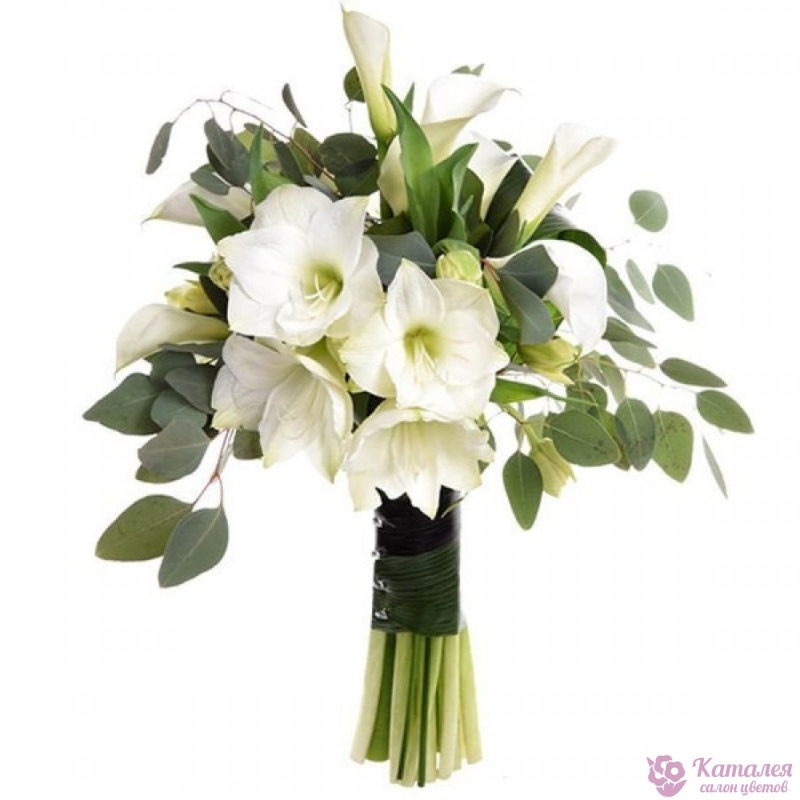 Букет состоит из 4 амариллиса, 9 калл, эвкалипт, прозрачная упаковка, атласная лента.