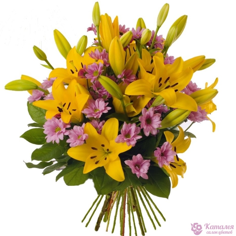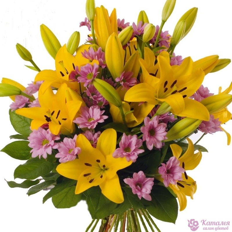 Букет состоит из 5 веток желтых лилии, 5 веток розовых хризантем, зелень, прозрачная упаковка, атласная лента.