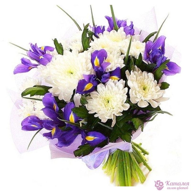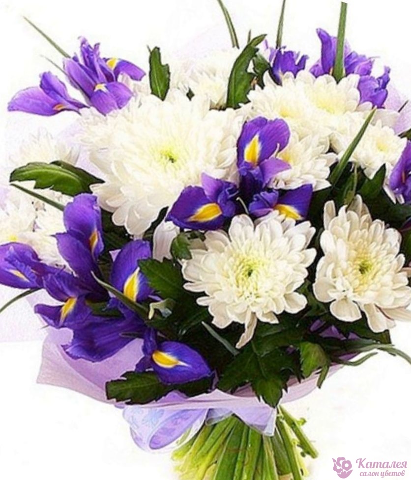 Букет состоит из 11 ирисов, 5 веток хризантемы, прозрачная упаковка, атласная лента.
