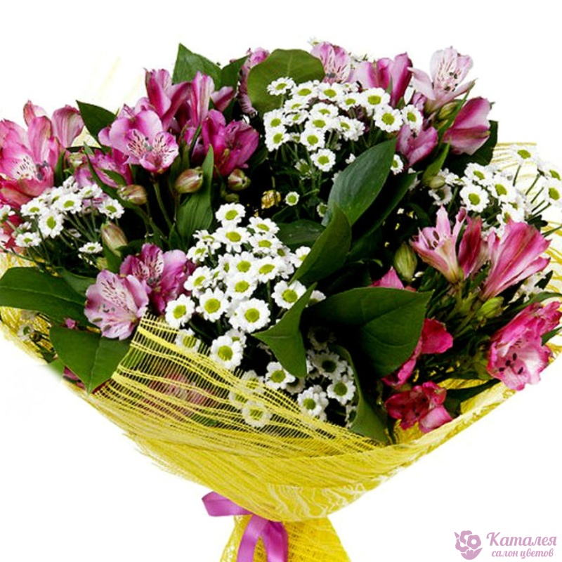 Букет состоит из 7 альстромерий, 4 ветки ромашковой хризантемы, салал, красивая упаковка, атласная лента.