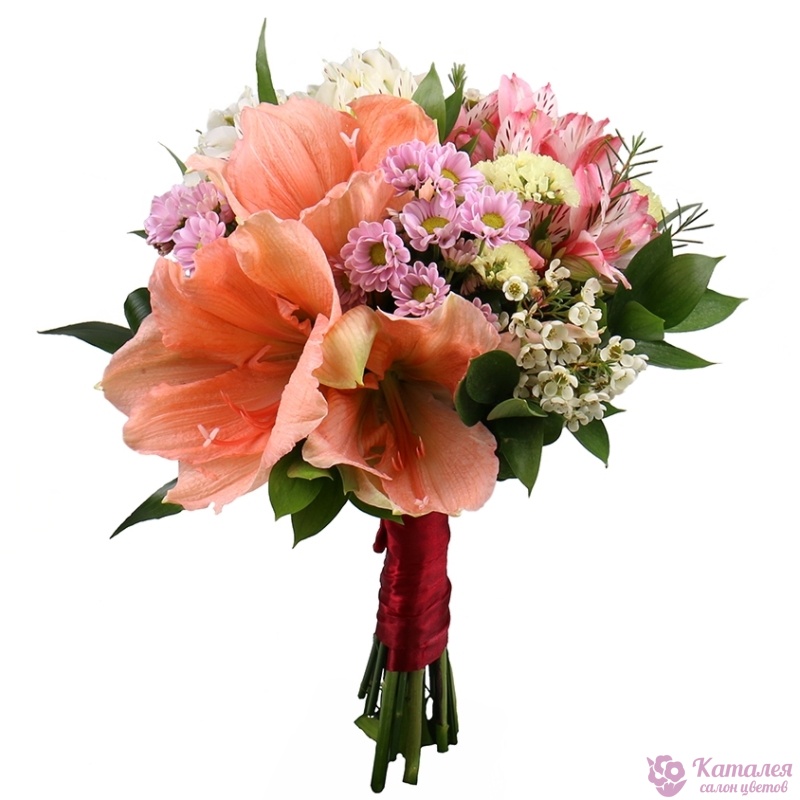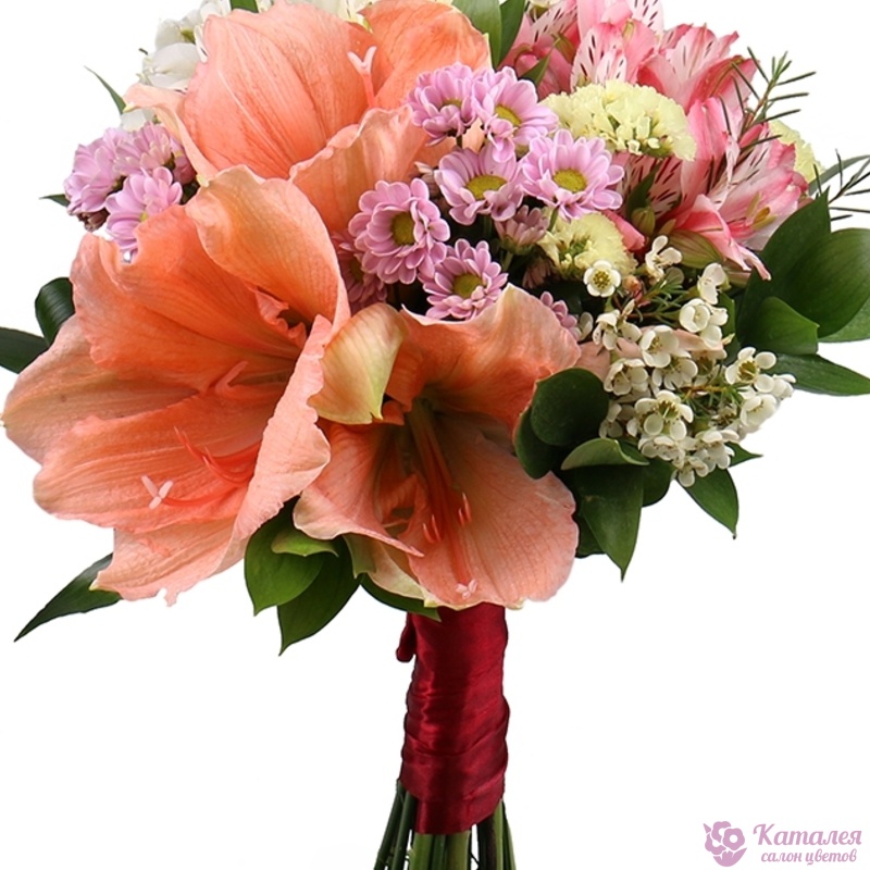 Букет состоит из 2 амариллиса, 4 ветки альстромерии, 2 ветки хризантемы, 2 ветки хамелациума, зелень, прозрачная упаковка, атласная лента.