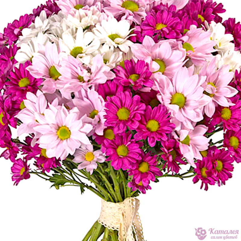 Букет состоит из MIX из 11 веток белой / розовой и красной хризантемы, прозрачная упаковка, атласная лента.