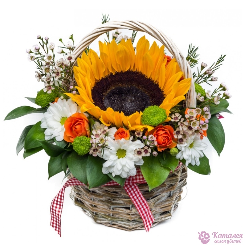 Букет состоит из 1 подсолнух, 3 ветки ваксфлауэра, 3 кустовые розы, 4 ветки кустовых хризантем, зелень, корзина, оазис.