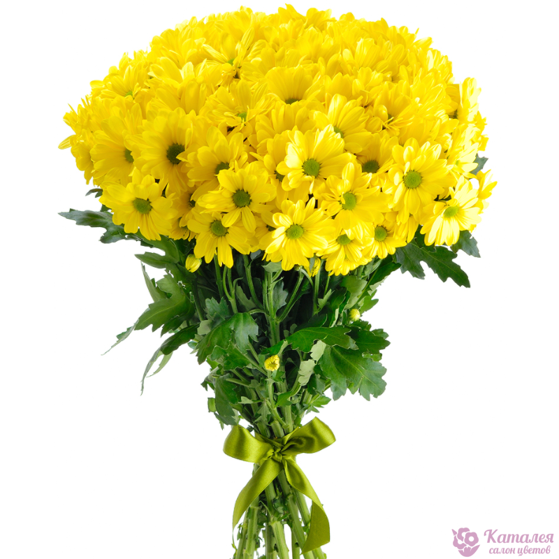 Букет состоит из 11 веток желтой хризантемы, прозрачна упаковка, атласная лента.