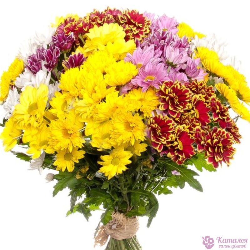 Букет состоит из MIX из 15 веток хризантем, прозрачная упаковка, атласная лента.