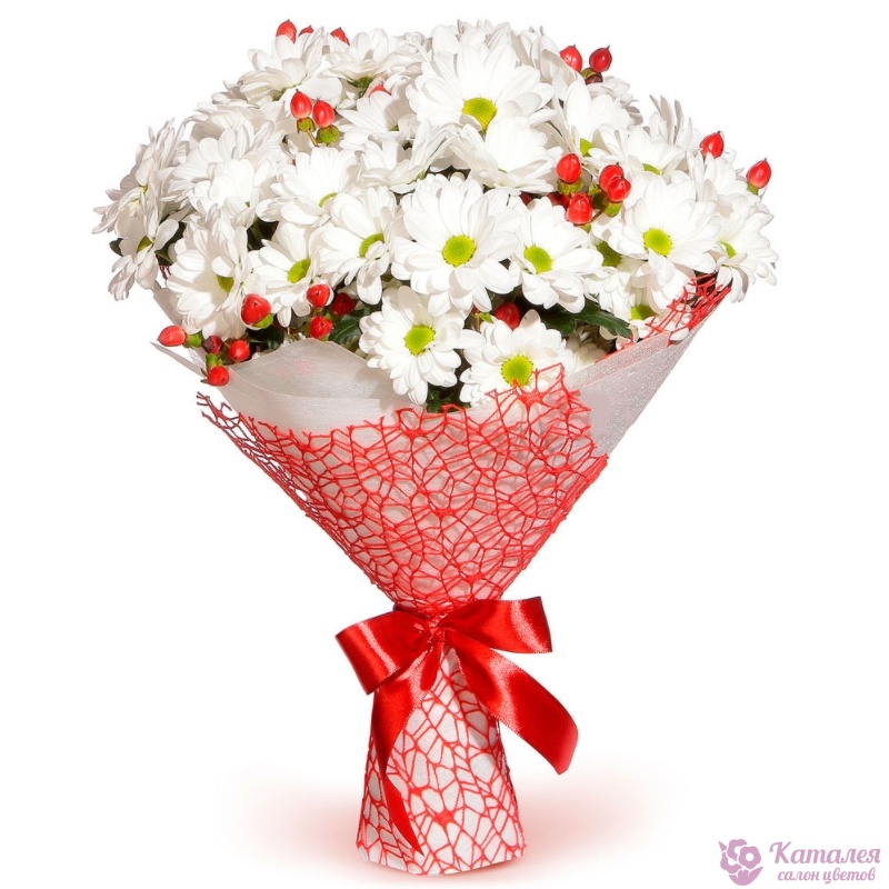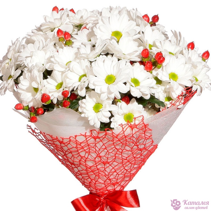 Букет состоит из 7 веток белой хризантемы, 4 гиперикума, красивая упаковка, атласная лента.