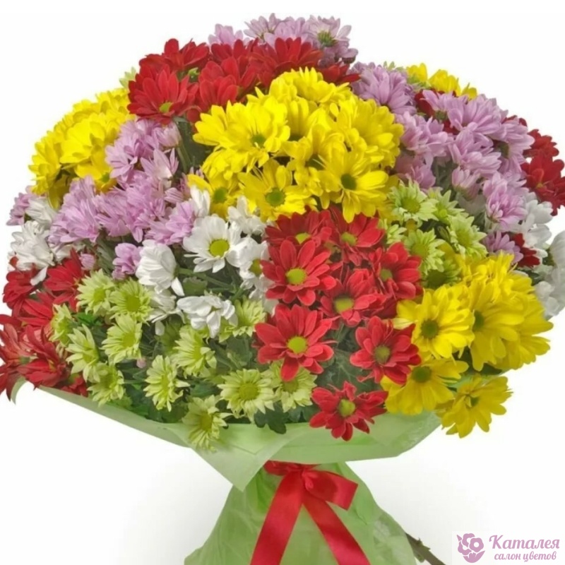 Букет состоит из 5 зеленых хризантем, 5 белых хризантем, 5 желтых хризантем, 5 розовых хризантем, 5 красных хризантем, красивая упаковка, атласная лента.