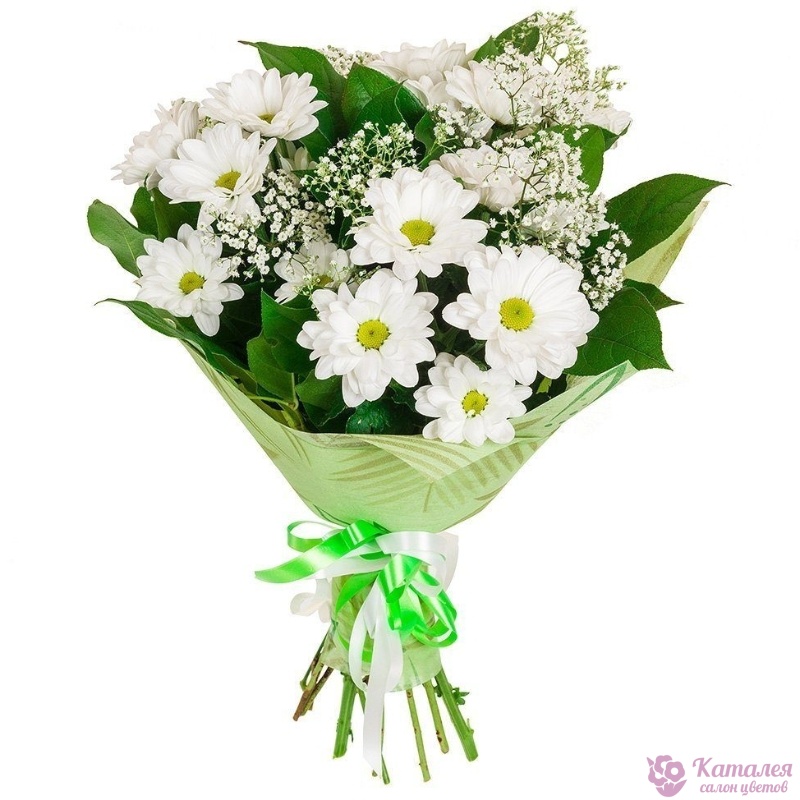 Букет состоит из 3 ветки белой хризантемы, 2 ветки гипсофилы, зелень, красивая упаковка, атласная лента.