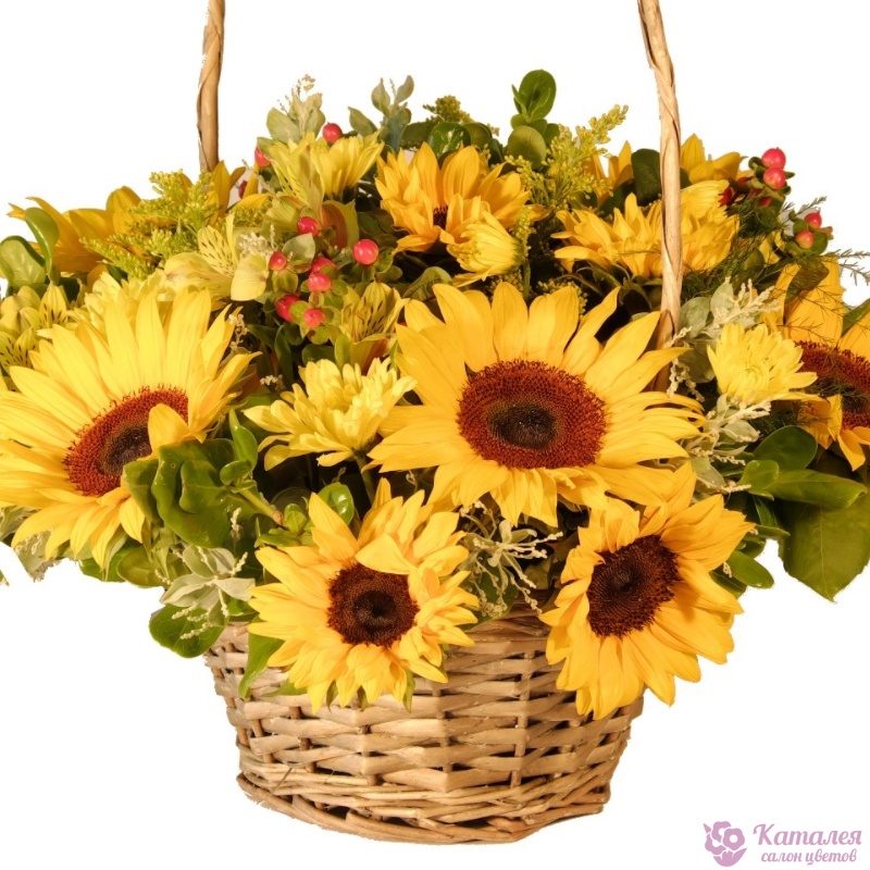 Букет состоит из 15 подсолнухов, 3 ветки альстромерии, 5 хризантем, 2 ветки солидаго, 3 гиперикума, зелень, корзина, оазис.