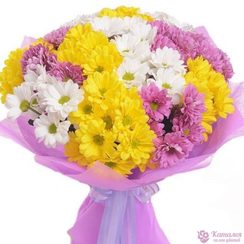 Букет состоит из 5 веток белой хризантемы, 5 веток желтой хризантемы, 5 веток розовой хризантемы , красивая упаковка, атласная лента.