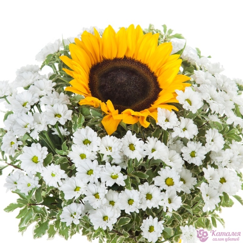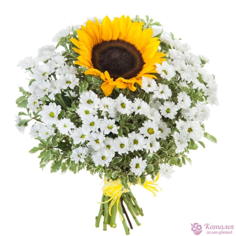 Букет состоит из 10 веток хризантем Сантини, 1 подсолнух, питтоспорум, прозрачная упаковка, атласная лента.