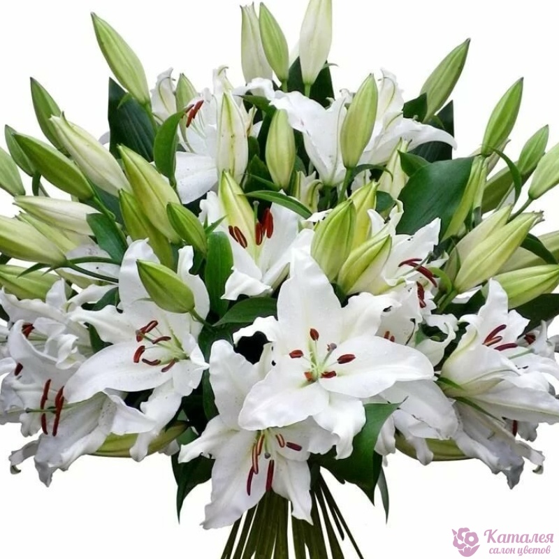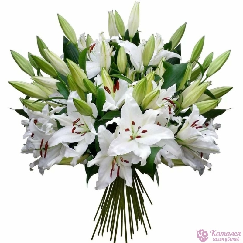 Букет состоит из 15 белых лилий, прозрачная упаковка, атласная лента.