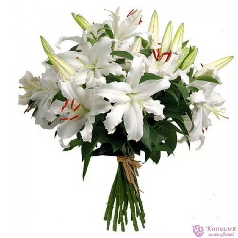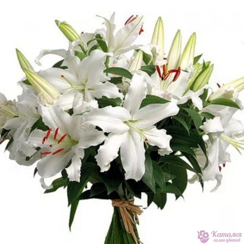 Букет состоит из 7 белых лилий, прозрачная упаковка, атласная лента.