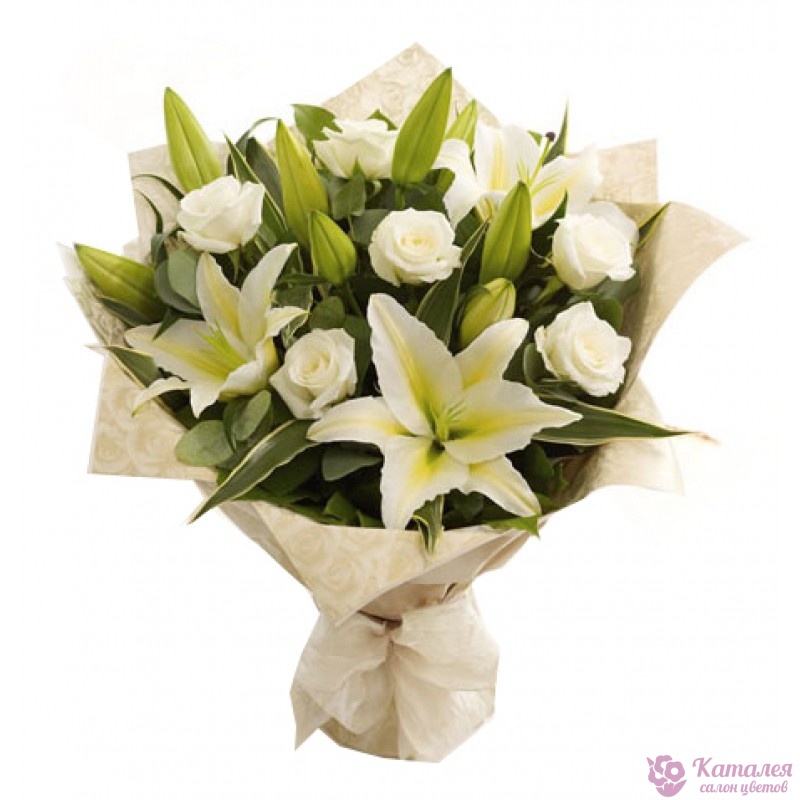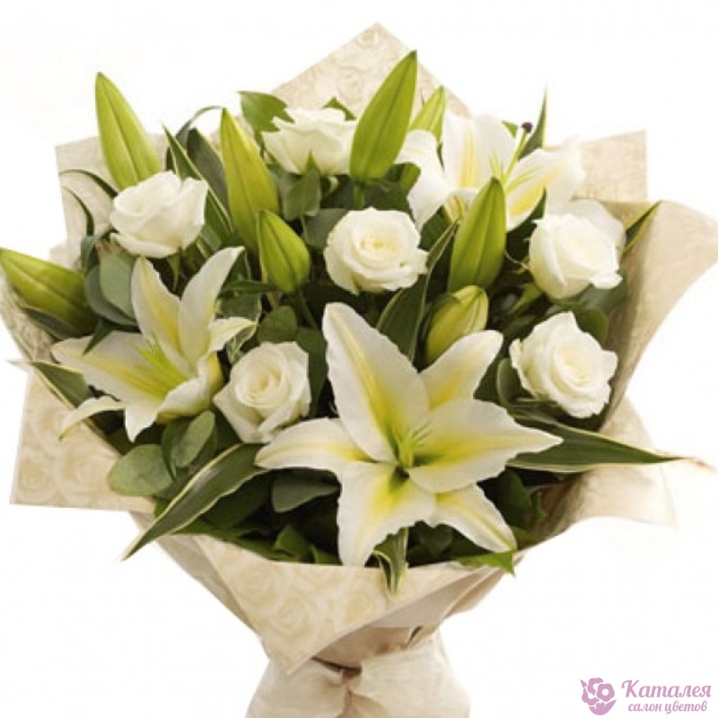 Букет состоит из 3 белых лилии, 9 белых роз, крафт, атласная лента.