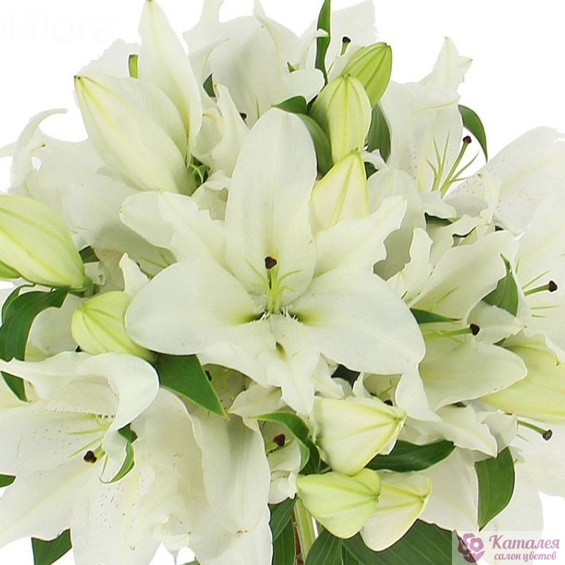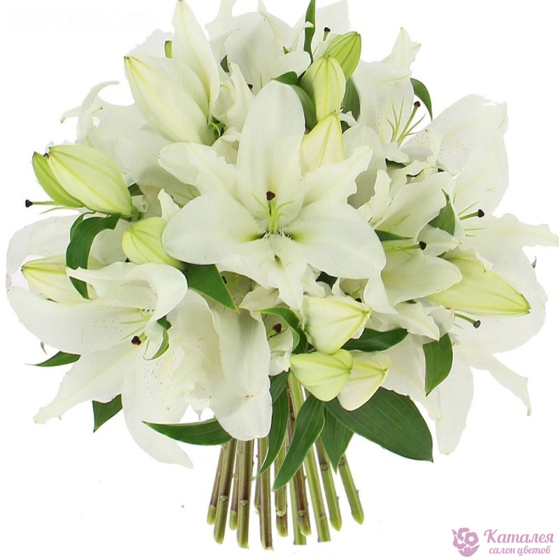 Букет состоит из 6 веток белых лилий, прозрачная упаковка, атласная лента.