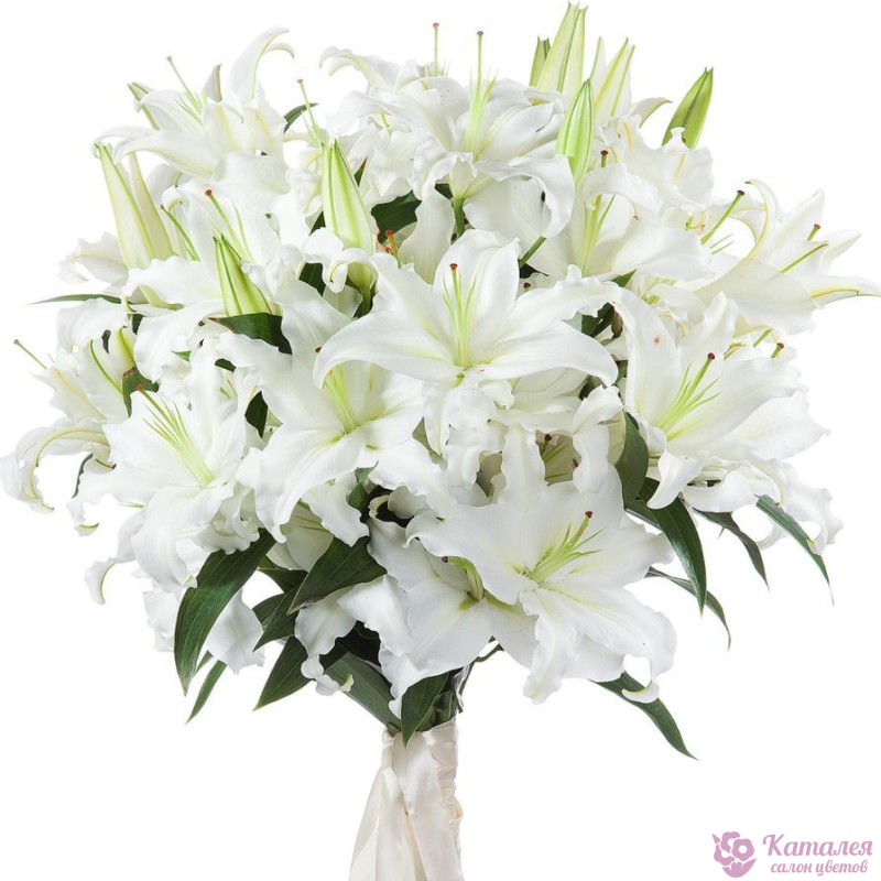 Букет состоит из 11 веток белых лилий, прозрачная упаковка, атласная лента.