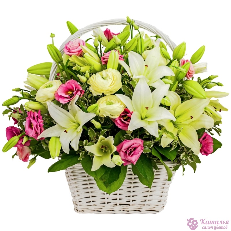 Букет состоит из 7 лилий, 5 ранункулюсов, 10 веток эустомы, зелень, корзина, оазис.
