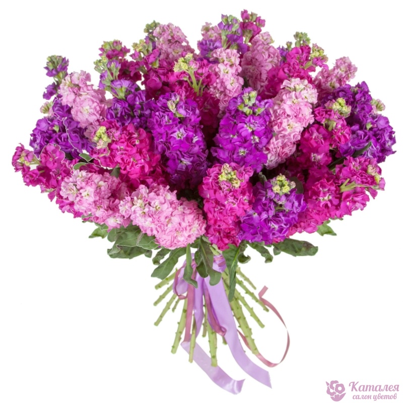 Букет состоит из MIX из 31 маттиолы, прозрачная упаковка, атласная лента.