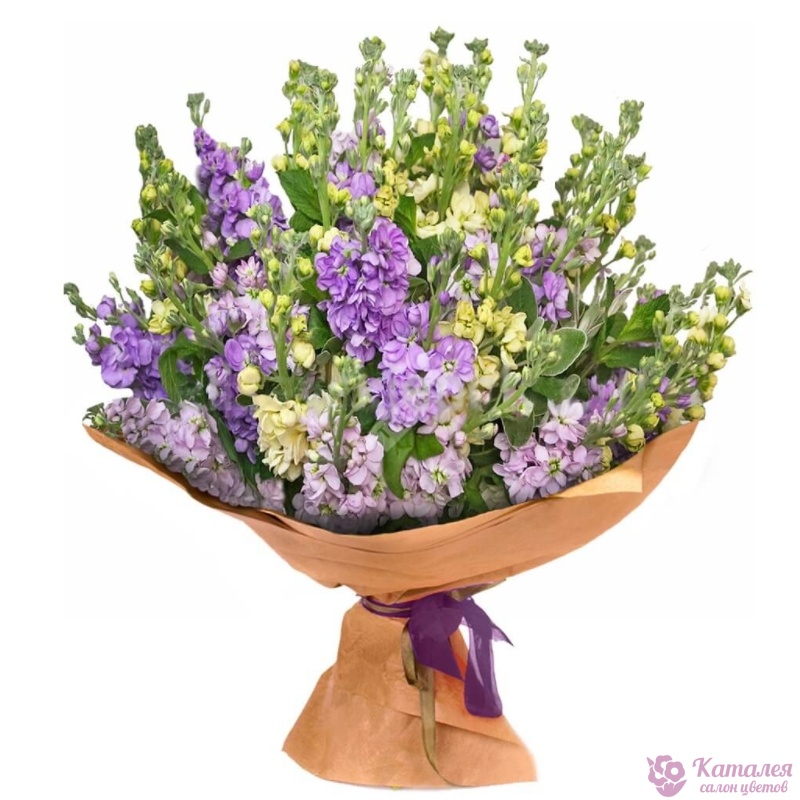 Букет состоит из 21 сиреневая маттиола, крафт, атласная лента.