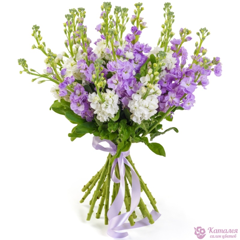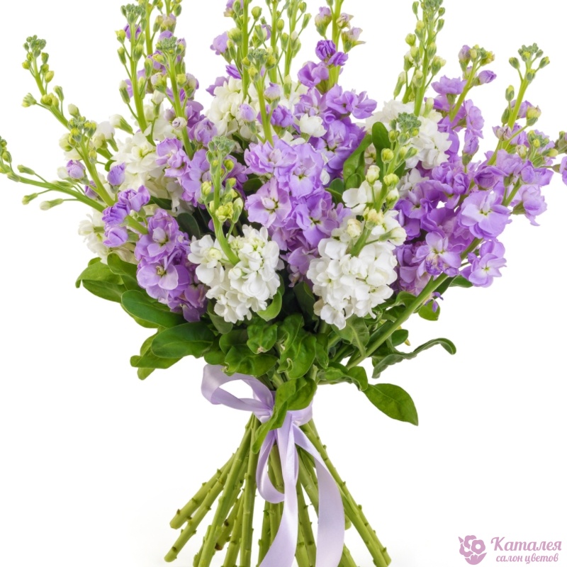 Букет состоит из MIX из 15 маттиол, прозрачная упаковка, атласная лента.