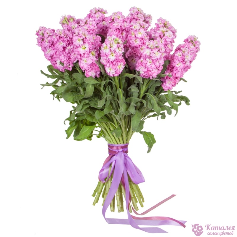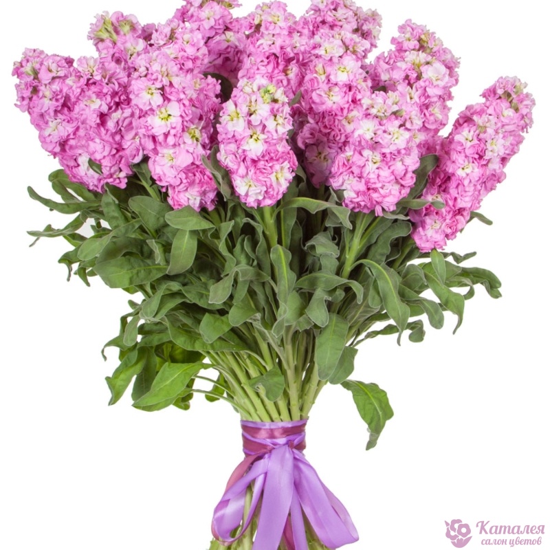 Букет состоит из 21 розовая маттиола, прозрачная упаковка, атласная лента.
