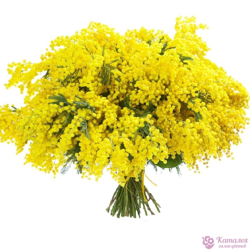Букет состоит из 41 ветка мимозы, прозрачная упаковка, лента.