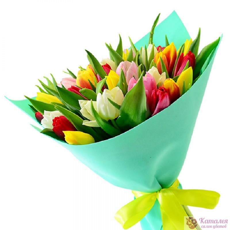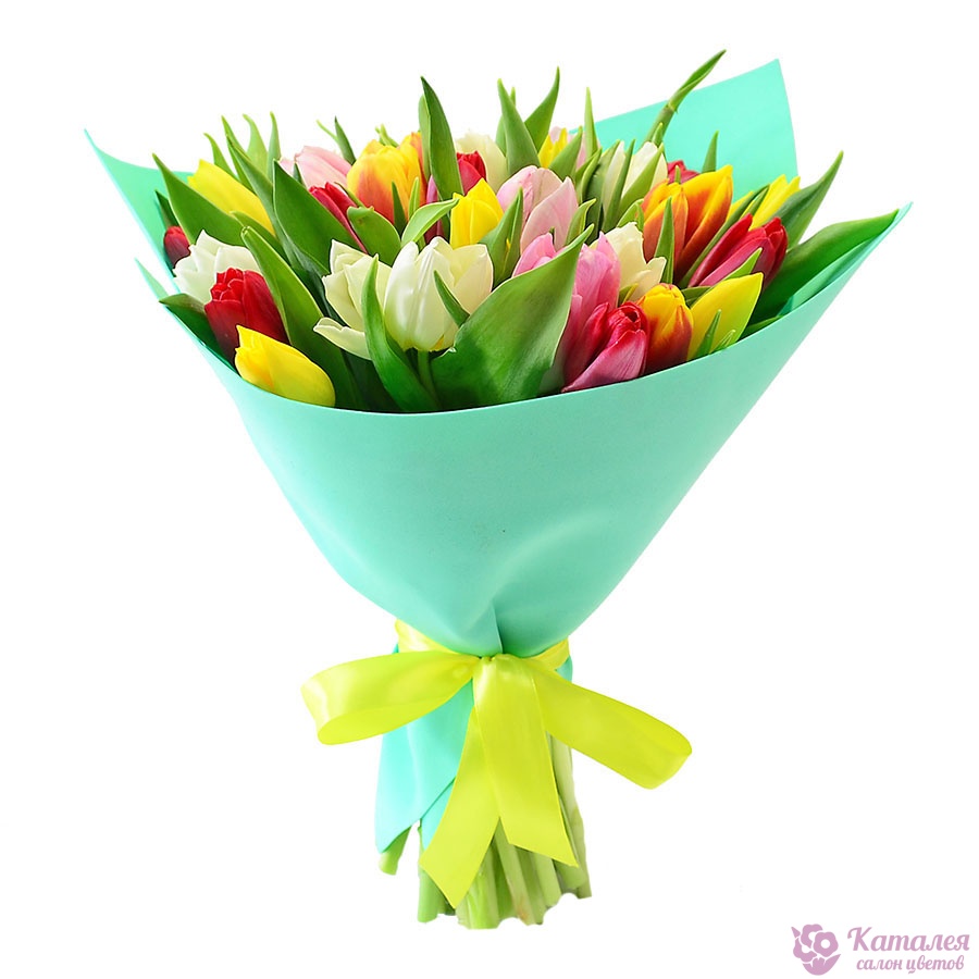 Букет состоит из MIX из 45 красных / желтых / белых и розовых тюльпанов, красивая упаковка, лента.
