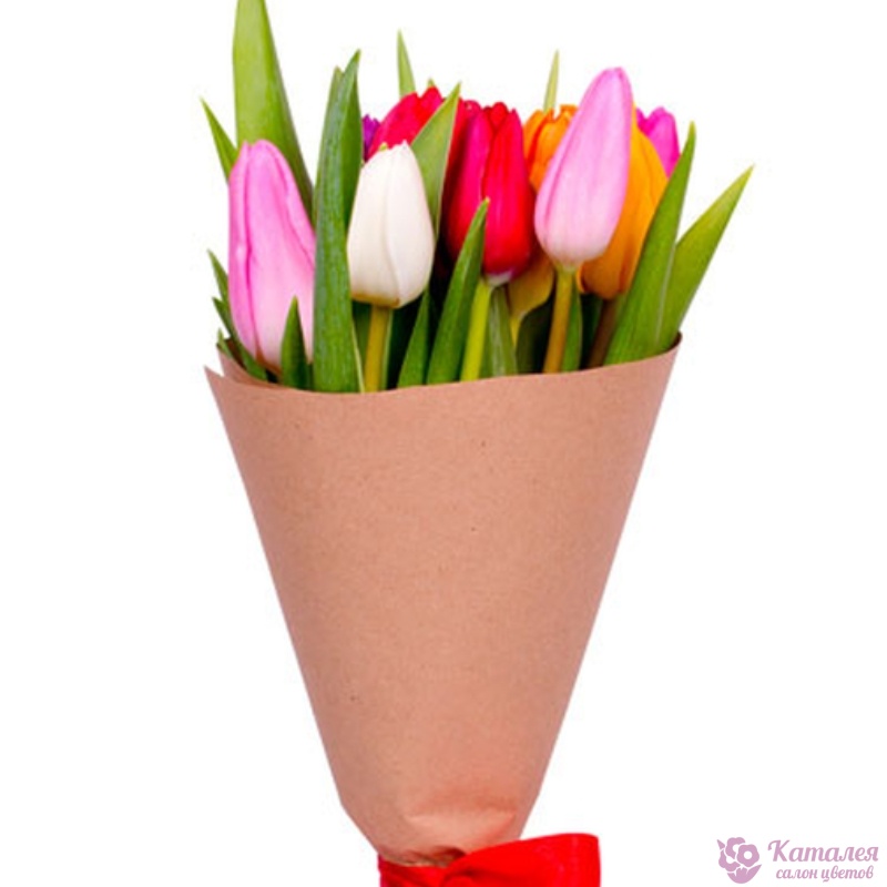 Букет состоит из 9 разноцветных тюльпанов, крафт, атласная лента.