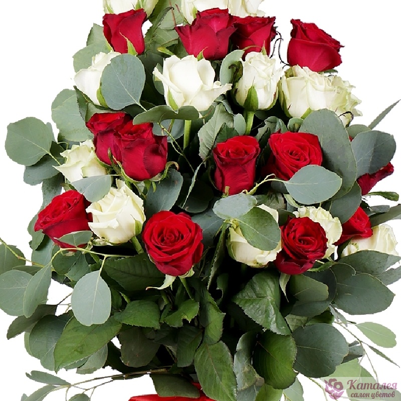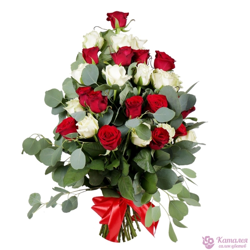 Букет состоит из 14 красных роз, 14 белых роз, эвкалипт, прозрачная упаковка, атласная лента.