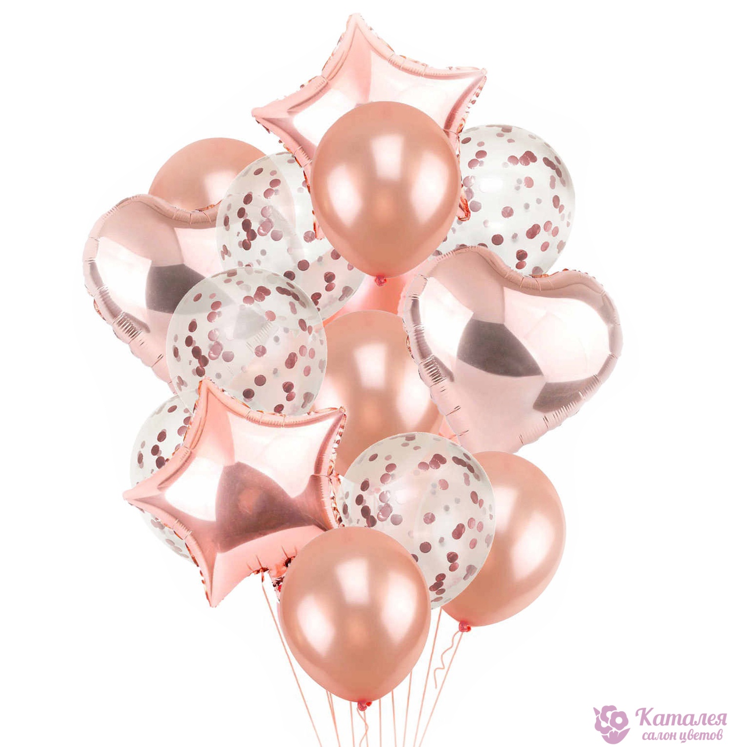 Стильный и очень солидный набор из воздушных шаров в цвете Розовое золото. В состав фонтана входят 8 латексных шаров в цвете Розовое золото, 5 прозрачных шаров с конфетти, 2 фольгированные звезды и 2 фольгированных сердца.