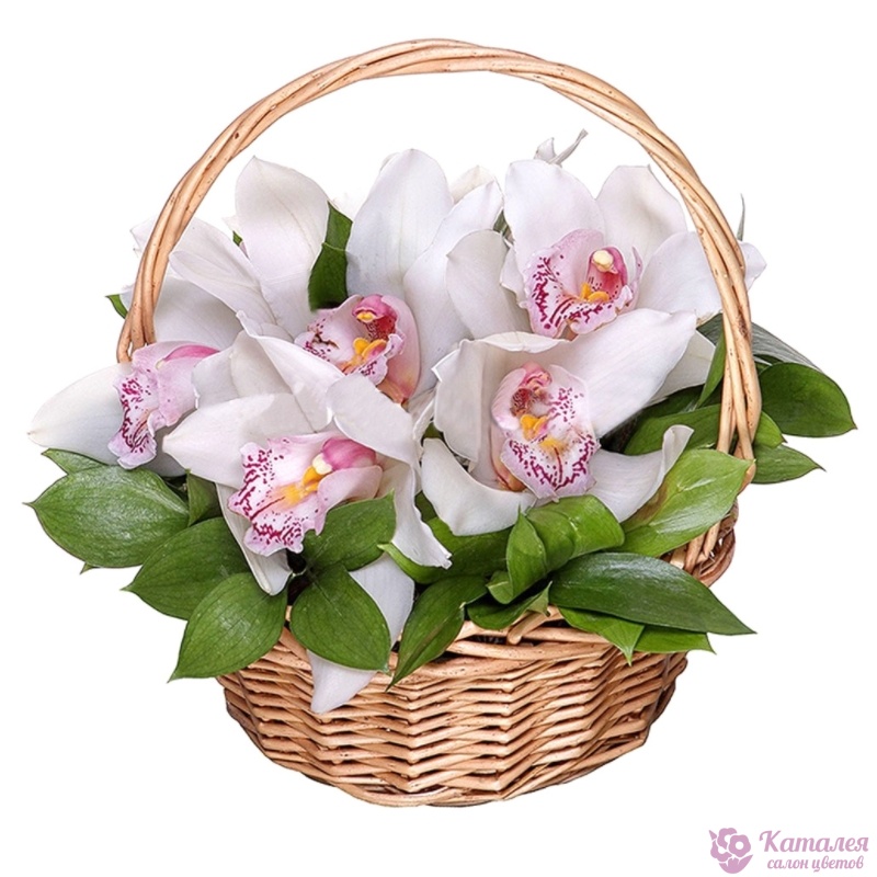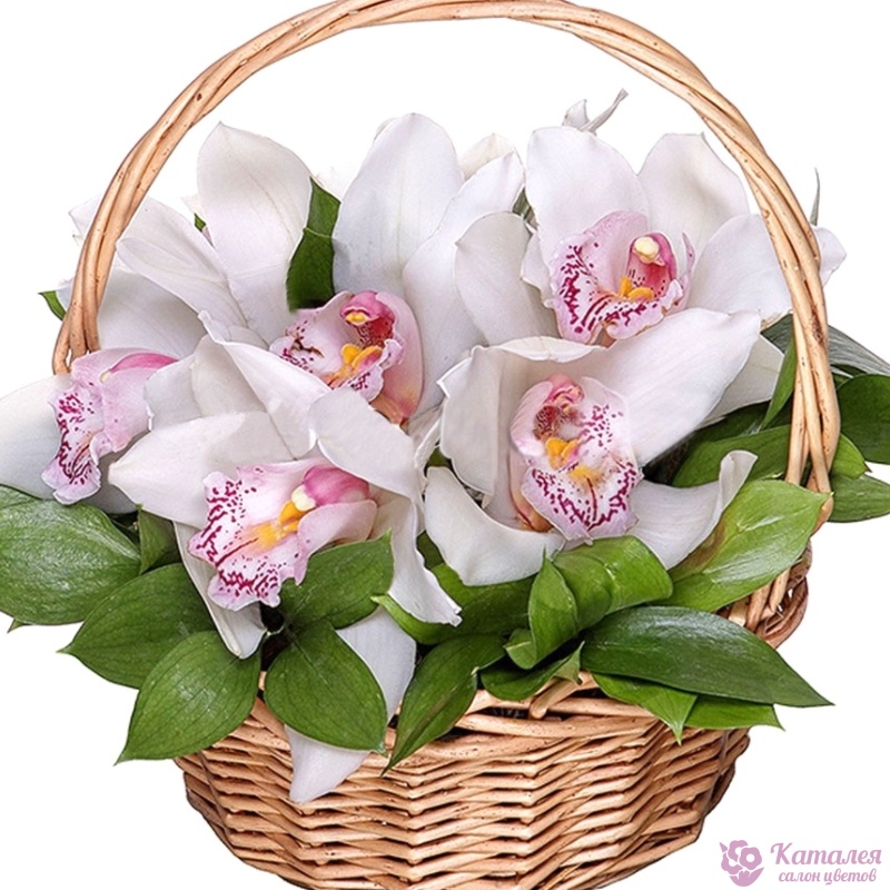 Букет состоит из 7 орхидей, зелень, корзина, оазис.