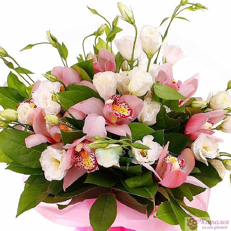 Букет состоит из 9 розовых орхидей, 6 веток эустомы, зелень, красивая упаковка, атласная лента.