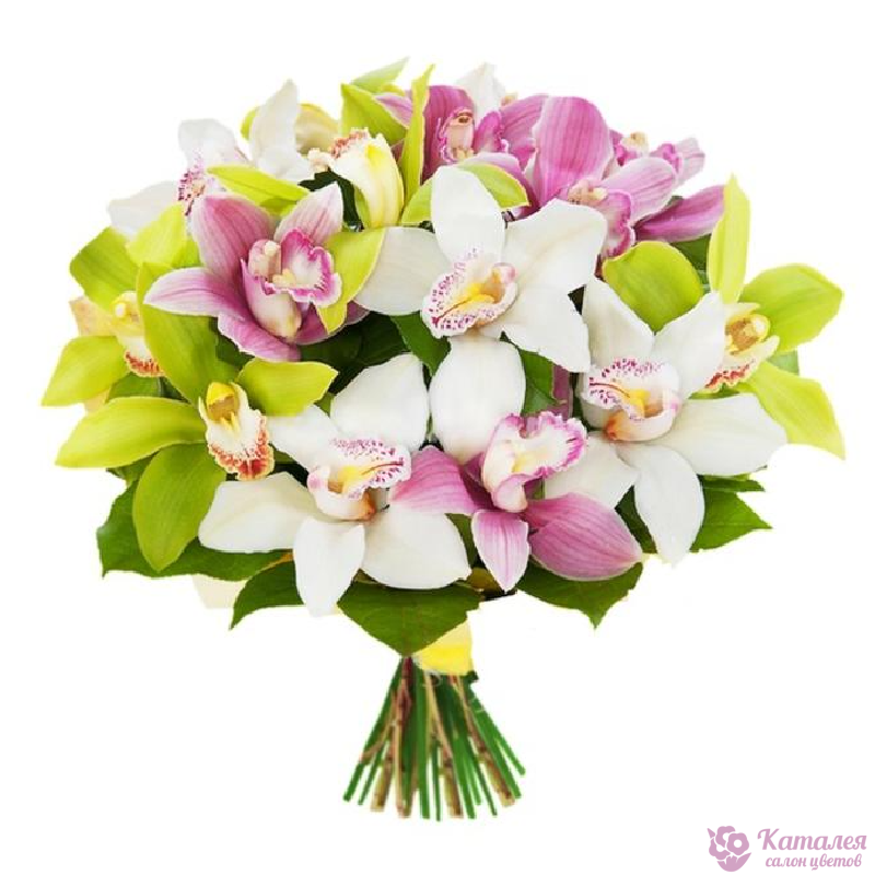 Букет состоит из MIX из 15 орхидей, прозрачная упаковка, атласная лента.