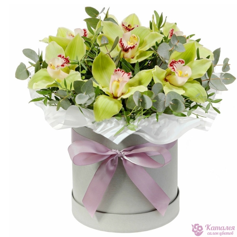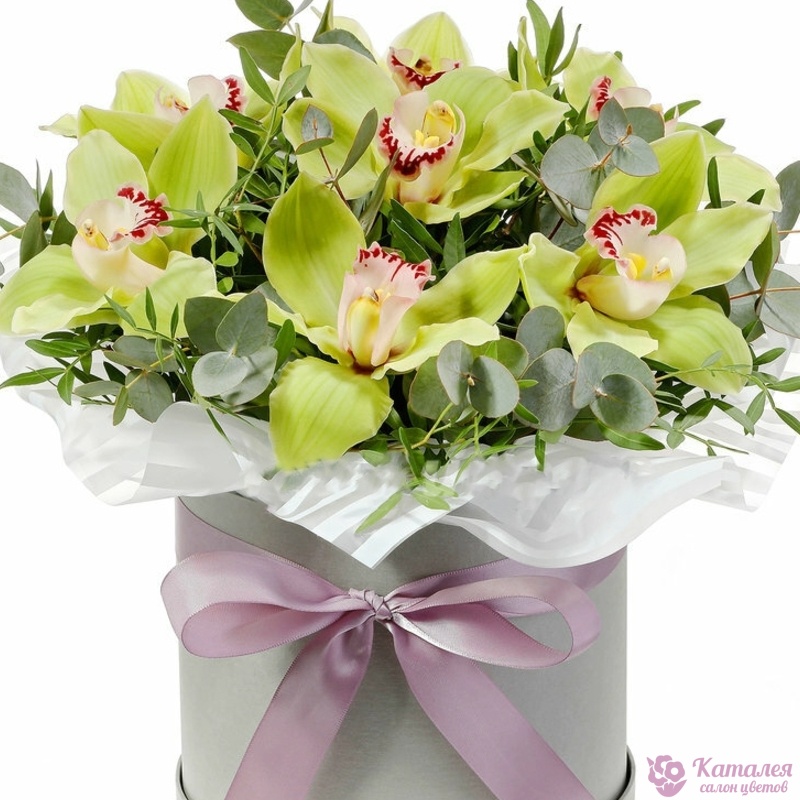 Букет состоит из 11 орхидей, зелень, коробка, оазис, атласная лента.
