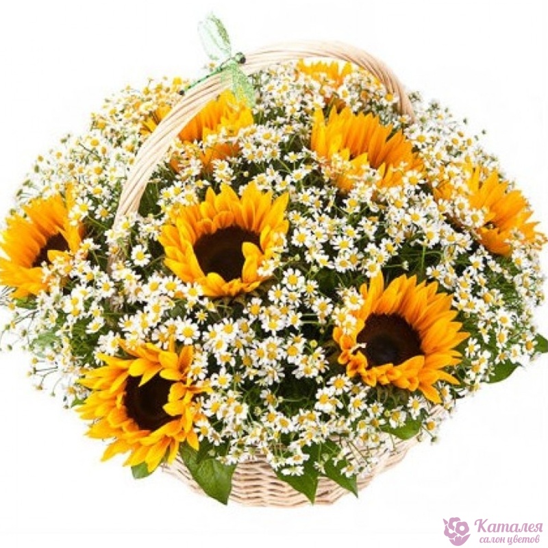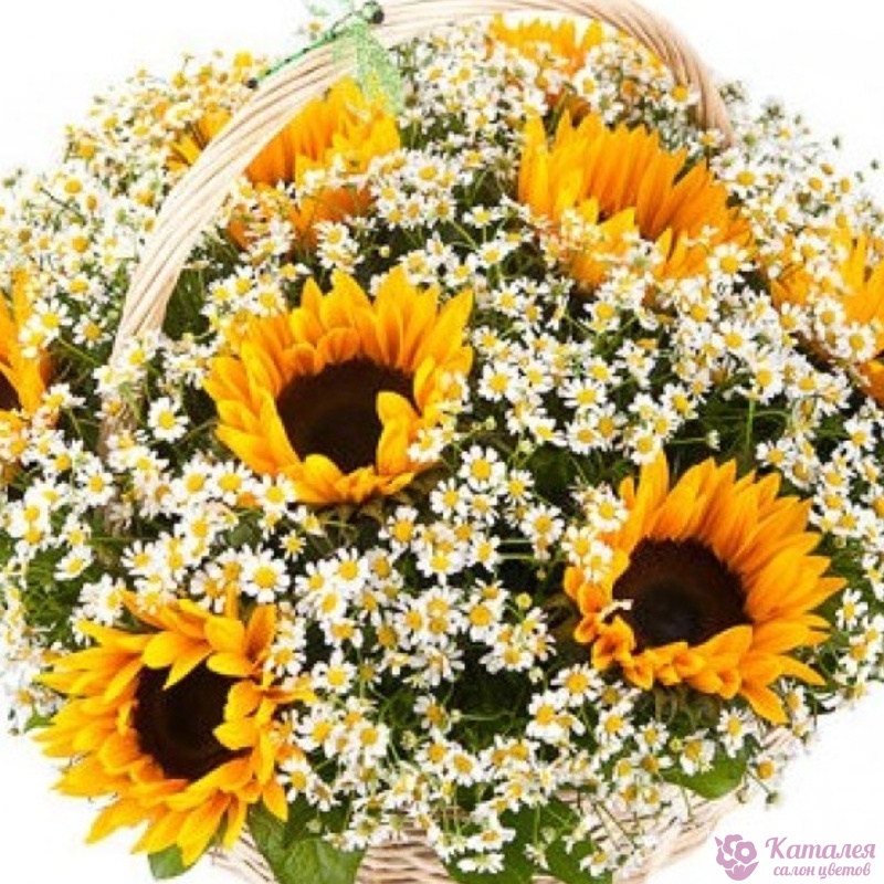 Букет состоит из 11 подсолнухов, 20 веток танацетума, корзина, оазис.