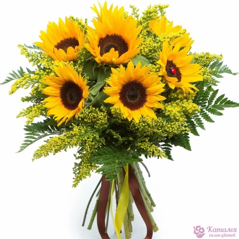 Букет состоит из 7 подсолнухов, 11 солидаго, зелень, прозрачная упаковка, атласная лента.