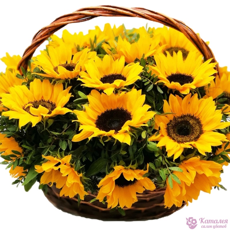 Букет состоит из 25 подсолнухов, зелень, корзина, оазис.