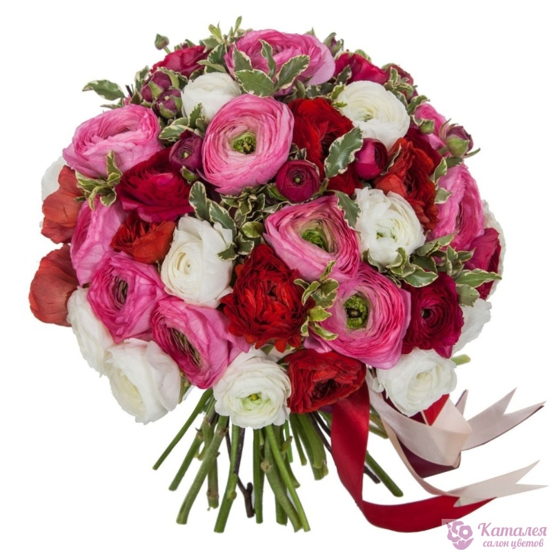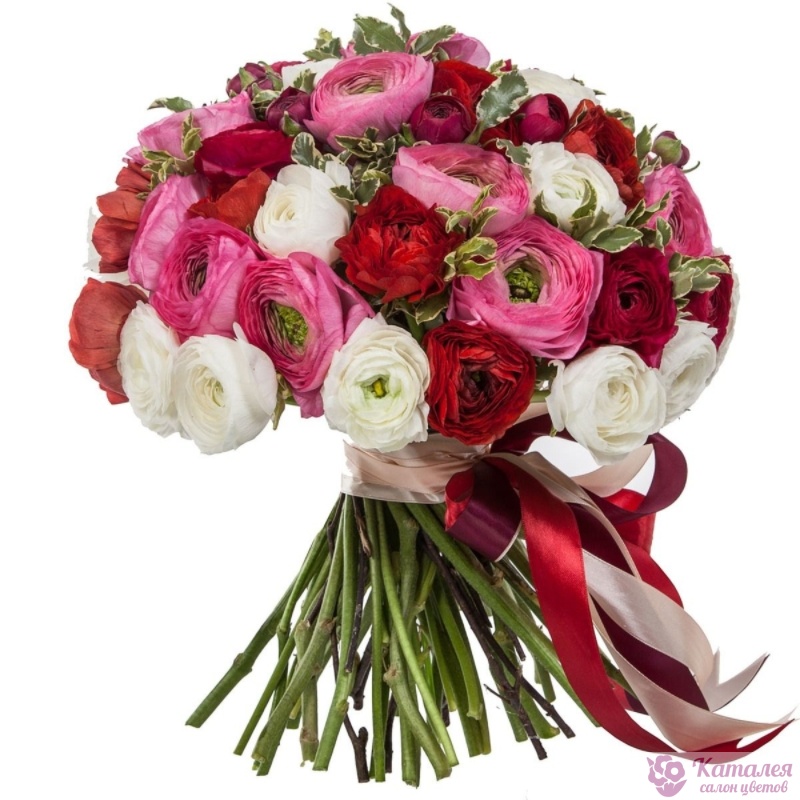 Букет состоит из MIX из 51 ранункулюса, зелень, прозрачная упаковка, атласная лента.