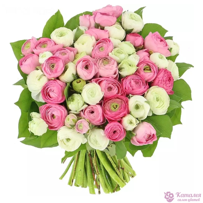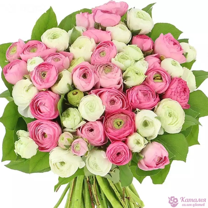 Букет состоит из MIX из 51 белого и розового ранункулюса, зелень, прозрачная упаковка, атласная лента.