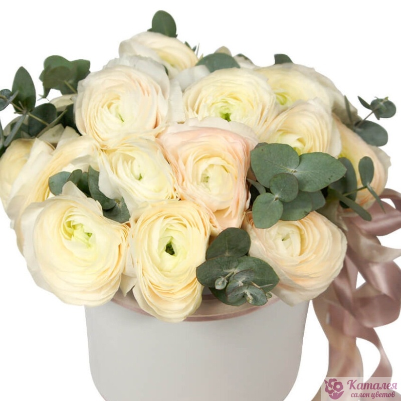 Букет состоит из 19 ранункулюсов, эвкалипт, коробка, оазис, атласная лента.