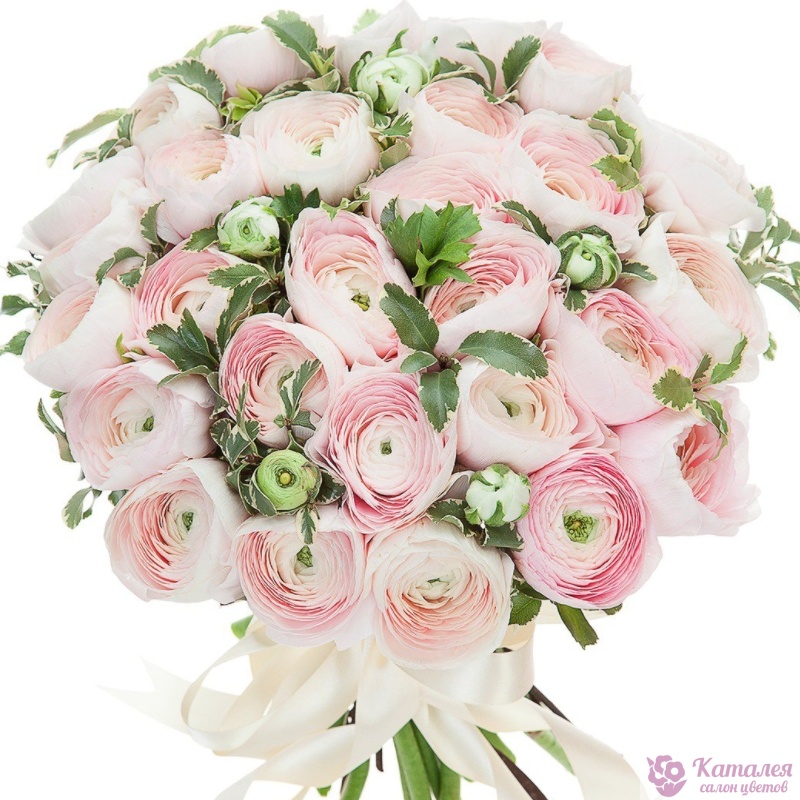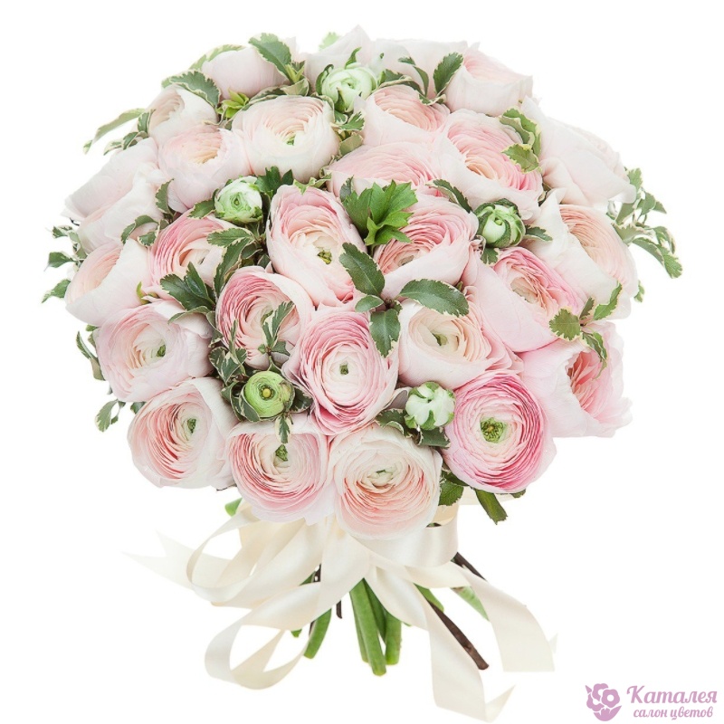Букет состоит из 31 розовый ранункулюс, питтоспорум, прозрачная упаковка, атласная лента.