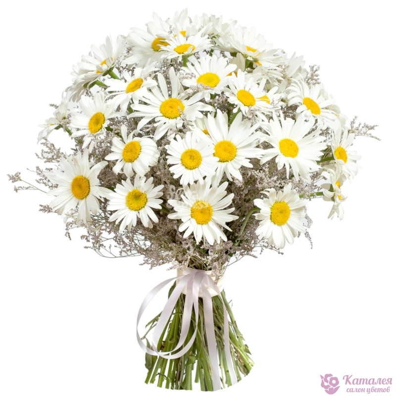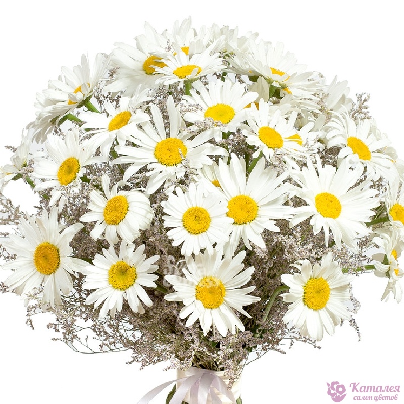 Букет состоит из 35 ромашек, 9 лимониум, прозрачная упаковка, атласная лента.