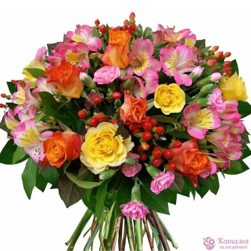 Букет состоит из 5 желтых роз, 5 оранжевых роз, 7 веток альстромерий, 7 веток кустовой гвоздики, 5 веток гиперикума, зелень, прозрачная упаковка, атласная лента.