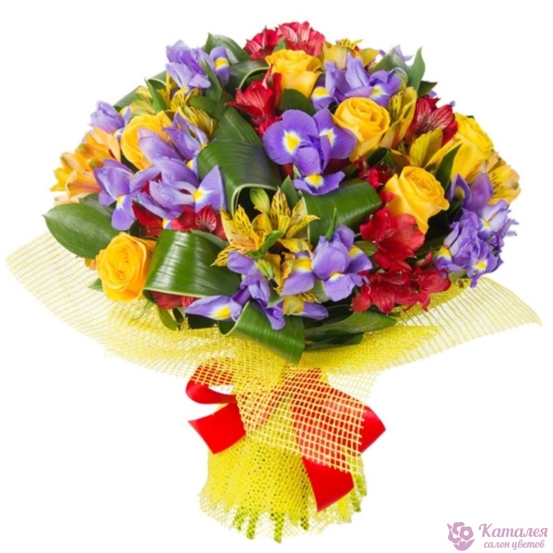 Букет состоит из 7 желтых роз, 15 ирисов, 11 желтых и белых альстромерий, аспидистра, сетка, атласная лента.