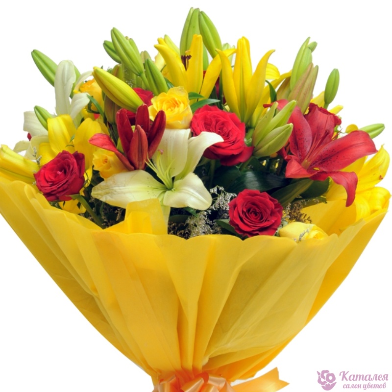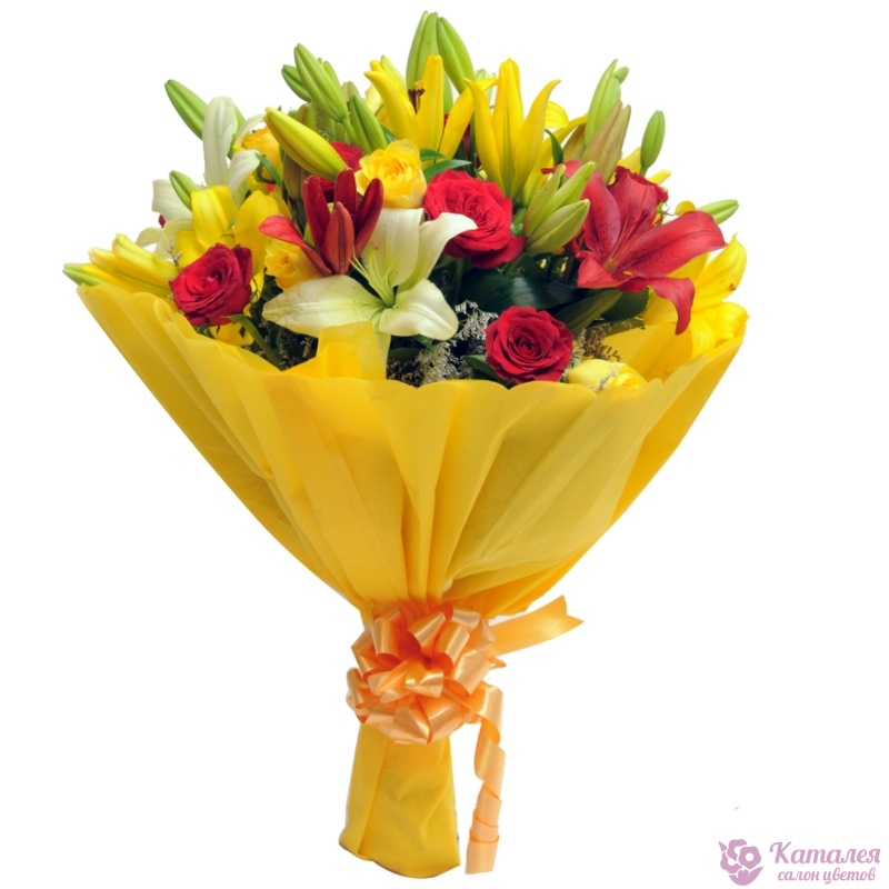Букет состоит из 5 красных роз, 5 желтых роз, 2 ветки белой лилии, 4 ветки желтой лилии, зелень, красивая упаковка, атласная лента.