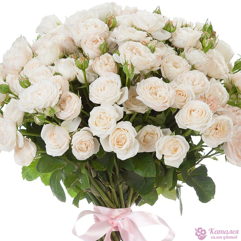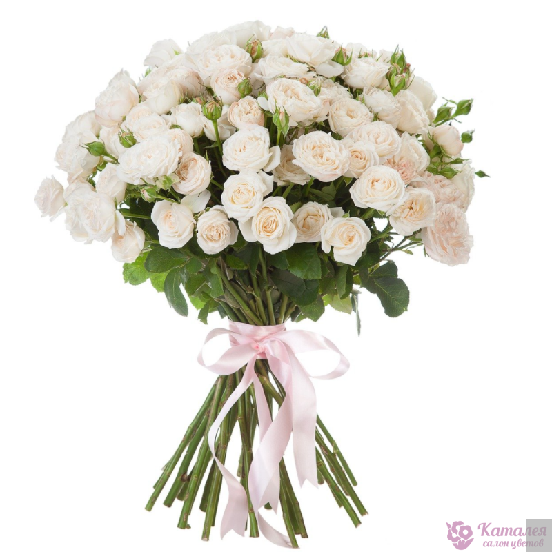 Букет состоит из 21 ветка белой кустовой розы, прозрачная упаковка, атласная лента.