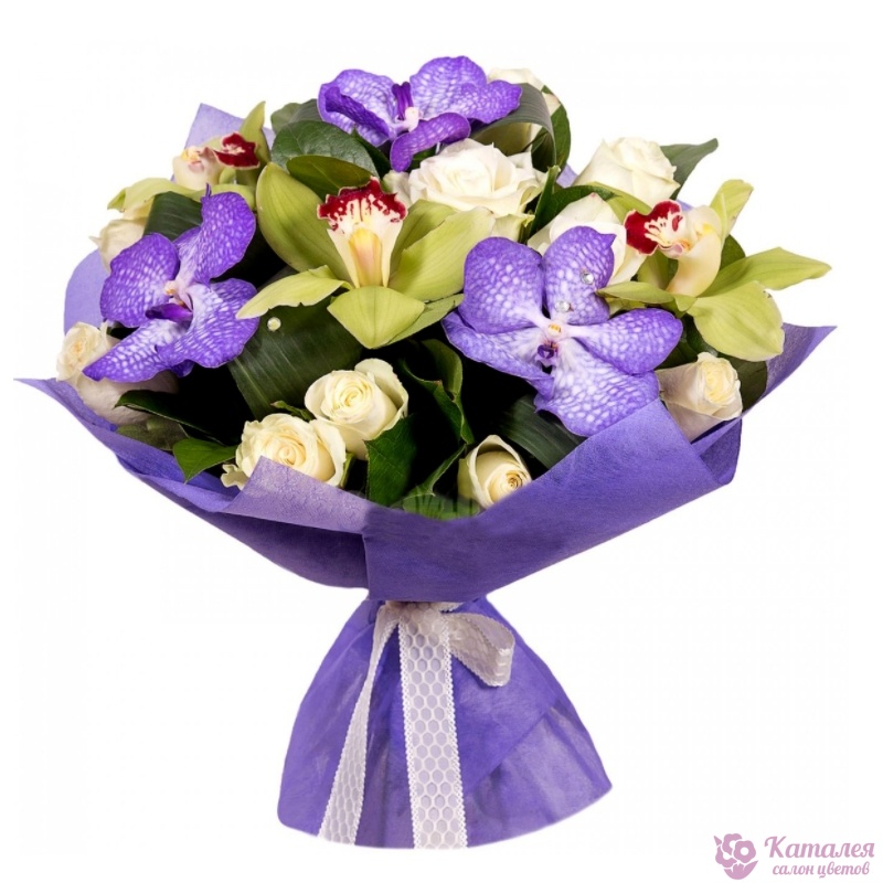Букет состоит из 11 роз, 6 орхидей, зелень, красивая упаковка, атласная лента.