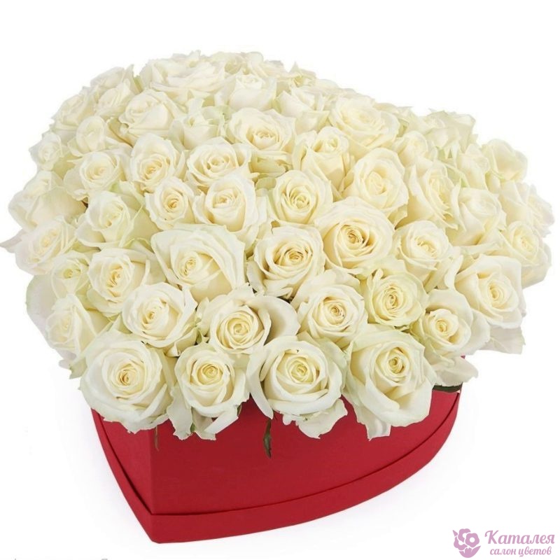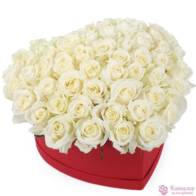 51 белая роза, коробка в виде сердца.