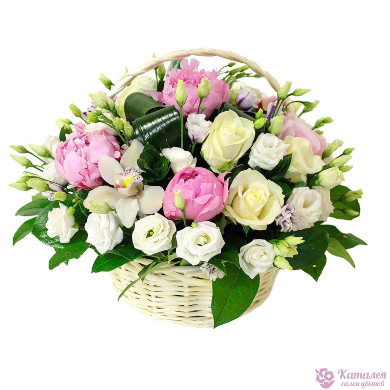 Букет состоит из 5 пионов, 7 роз, 2 орхидеи, 7 веток эустомы, зелень, корзина, оазис.